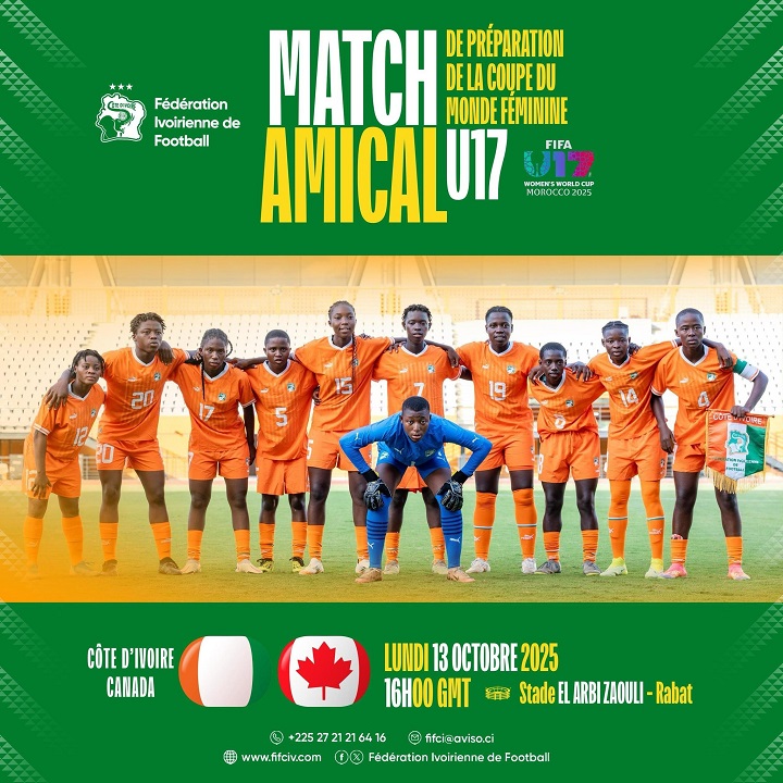 Pour la première fois de son histoire, la Côte d’Ivoire participera à la phase finale de la Coupe du monde féminine U17 qui se tiendra au Maroc. En prélude à cette compétition, la sélection Ivoirienne disputera une rencontre amicale face au Canada ce Lundi 13 octobre à 16H GMT au stade EL ARBI ZAOULI de Rabat. Les Eléphanteaux sont déjà sur les terres du Royaume Chérifien depuis le mercredi 8 octobre 2025. La Côte d’Ivoire est logée dans le groupe E en compagnie de l’Espagne, la Colombie et la Corée du Sud.
