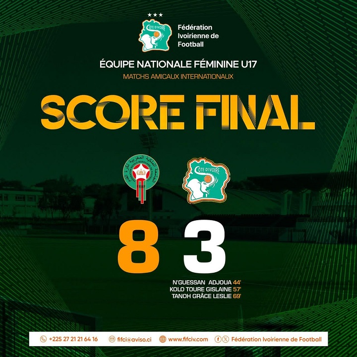Au Maroc pour disputer deux rencontres amicales face à la sélection Marocaine féminine U17, les Eléphantes U17 ont été battues copieusement. Lors du premier match, la Côte d’Ivoire s’est inclinée 4 buts à 2 avant de chuter 8 à 2 à l’occasion du second match. Avec ces deux matchs amicaux, les dirigeants de la Fédération Ivoirienne de Football prépare l’avenir.