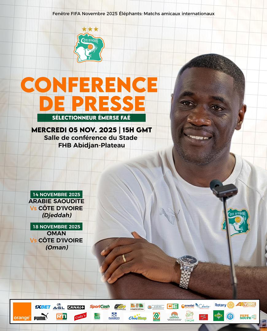 Le sélectionneur des Éléphants animera une conférence de presse avant cette double confrontation le mercredi 5 novembre 2025 à 15h00 à la salle de conférence du Stade Félix Houphouët-Boigny, Abidjan-Plateau.