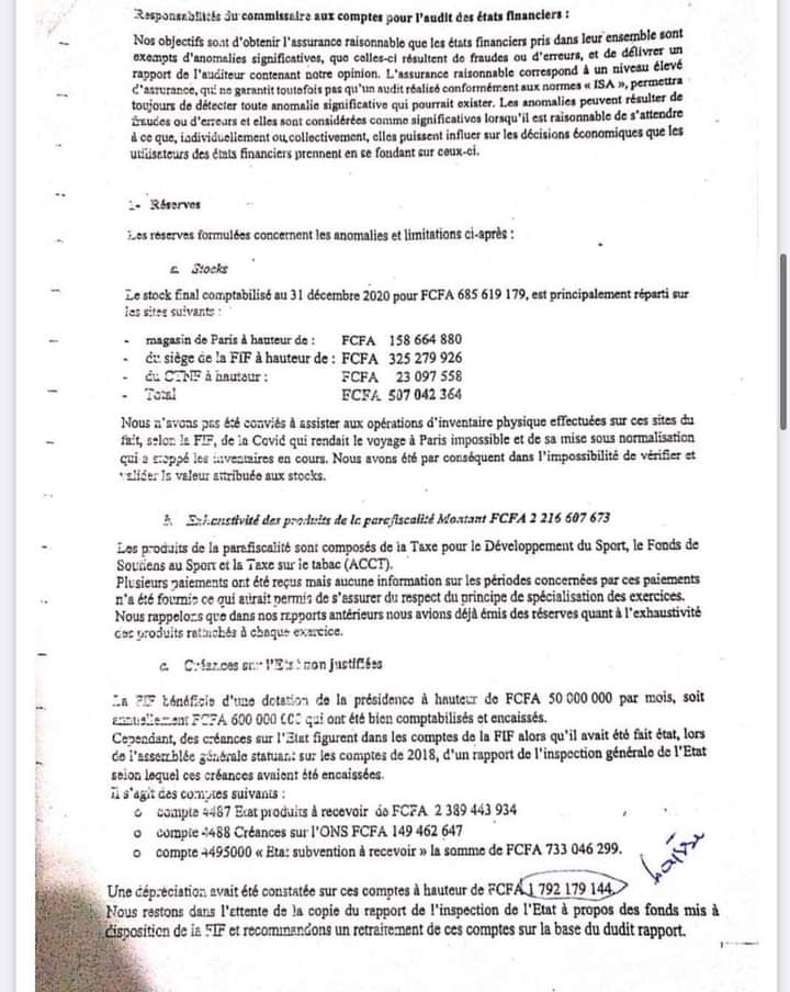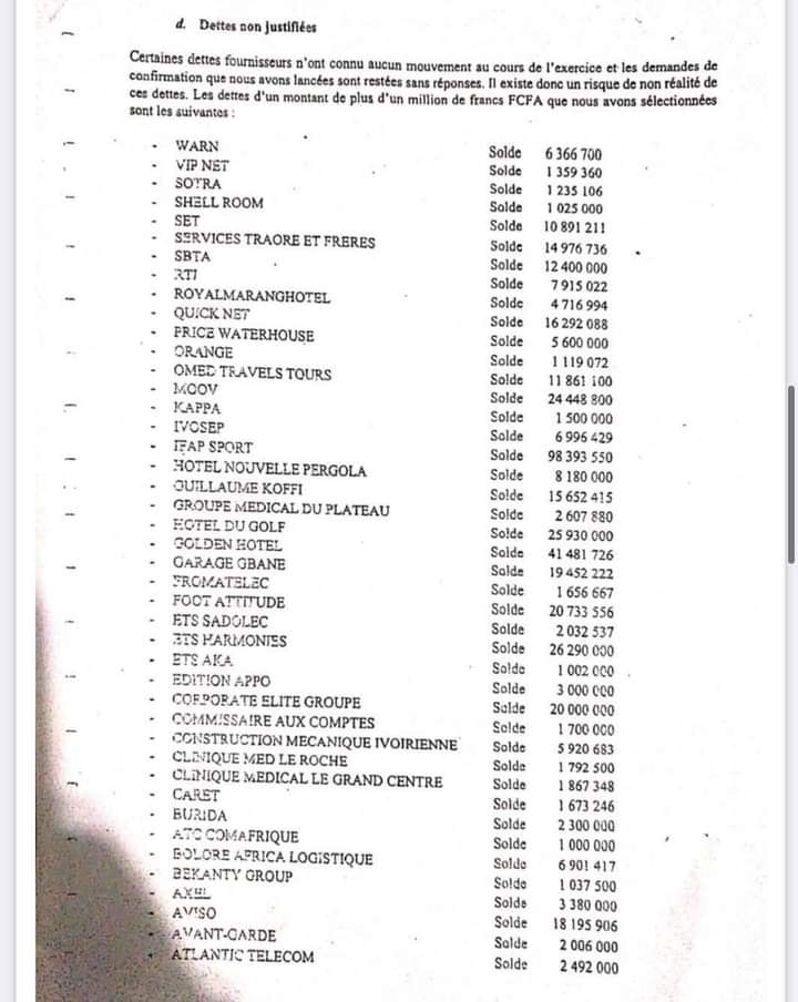 Le Comité Exécutif sortant de la FIF avec à sa tête Sory Diabaté a décidé de sortir de sa réserve pour se défendre suite à la conférence de presse animée par la Présidente du CONOR mardi dernier où elle a dévoilé quelques points de l’audit diligenté au sein de la maison de verre. L’ancien vice-Président et son équipe rejoint par Eugène Diomandé, ont littéralement contesté les dits de Mariam Dao Gabala. Après cette sortie du COMEX sortant, des documents se sont retrouvés sur la toile dont celui du rapport du commissaire au compte où plus de 2 milliards de parafiscalités se sont volatilisés sans aucune trace, plus d’un million de dettes non justifiées et 600 millions de la Présidence sans trace.