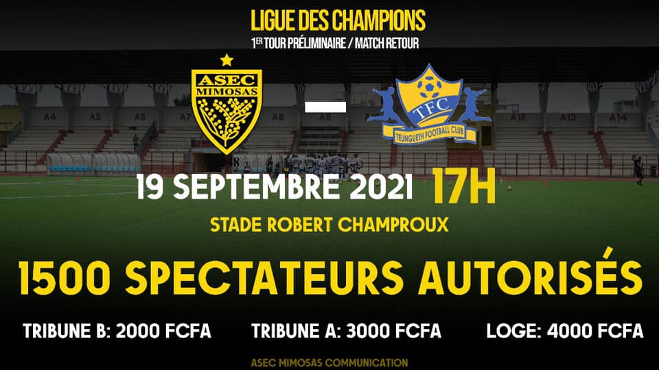 Ce dimanche 19 septembre, l’ASEC Mimosas accueillera ce 19 septembre au Champroux la formation Sénégalaise du FC Teungueth dans le cadre du match retour du premier tour préliminaire de la Ligue des Champions Africaine. A l’aller, les Mimos s’étaient imposés 1 but à 0 grâce à une réalisation de Diakité Oumar. Contrairement à la rencontre aller qui était à huis clos, celle du retour se disputera devant 1500 spectateurs. La tribune A comptera 600 personnes tandis que la B sera elle de 800. La loge comptera 100 personnes dont les Présidents des deux clubs.