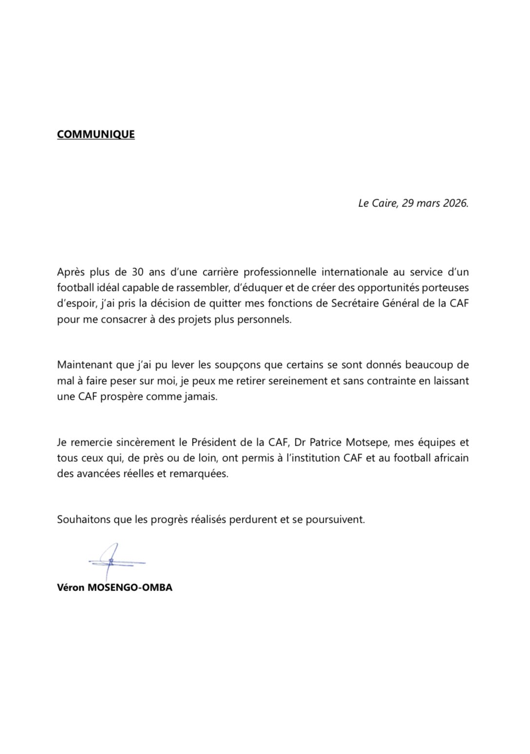 « Après plus de 30 ans de carrière professionnelle internationale consacrée à la promotion d’un football idéal qui rassemble les gens, éduque et crée des opportunités d’espoir, j’ai décidé de quitter mon poste de secrétaire général de la CAF pour me consacrer à des projets plus personnels »,