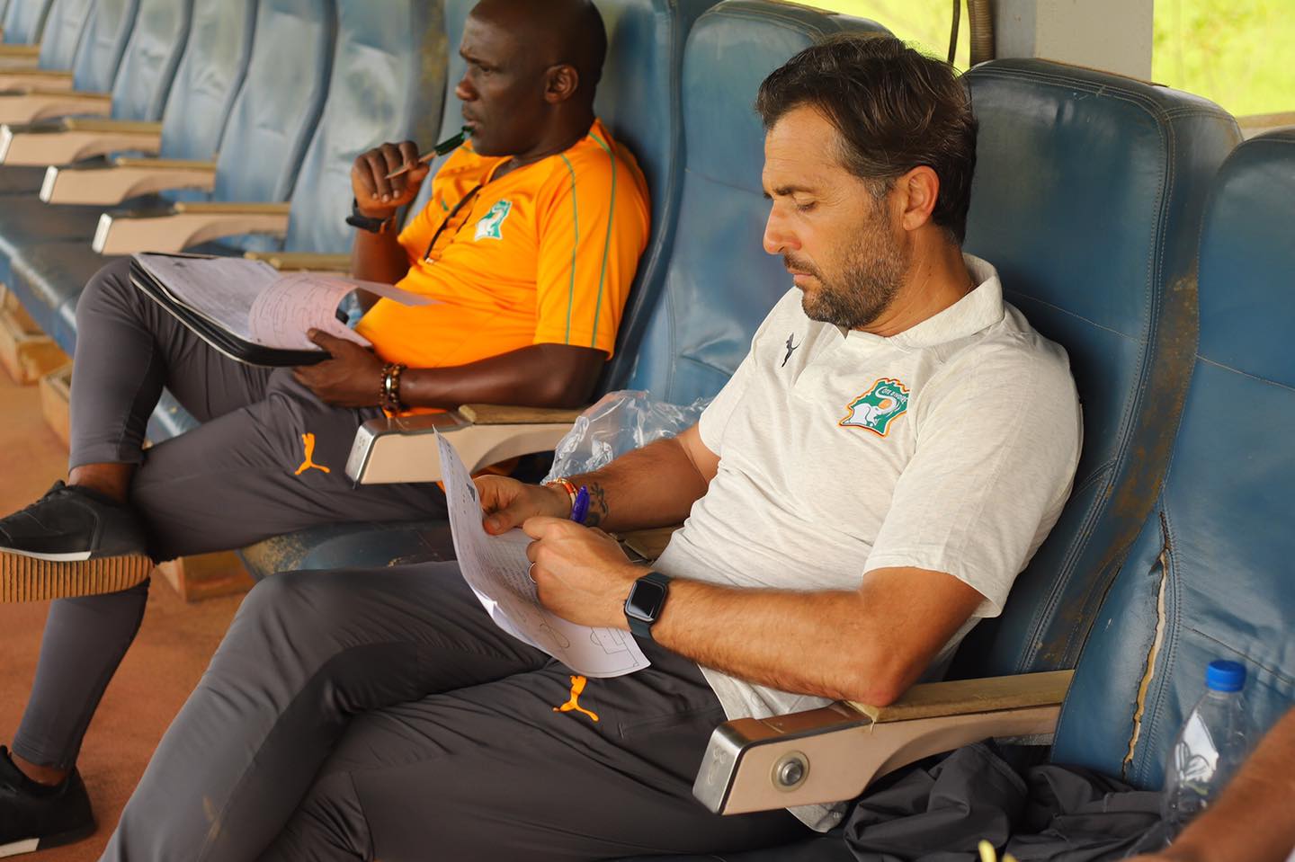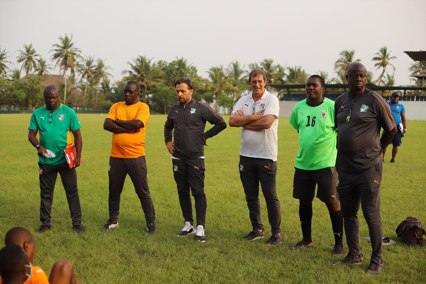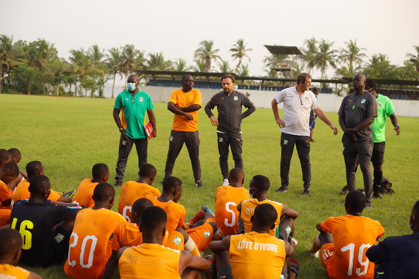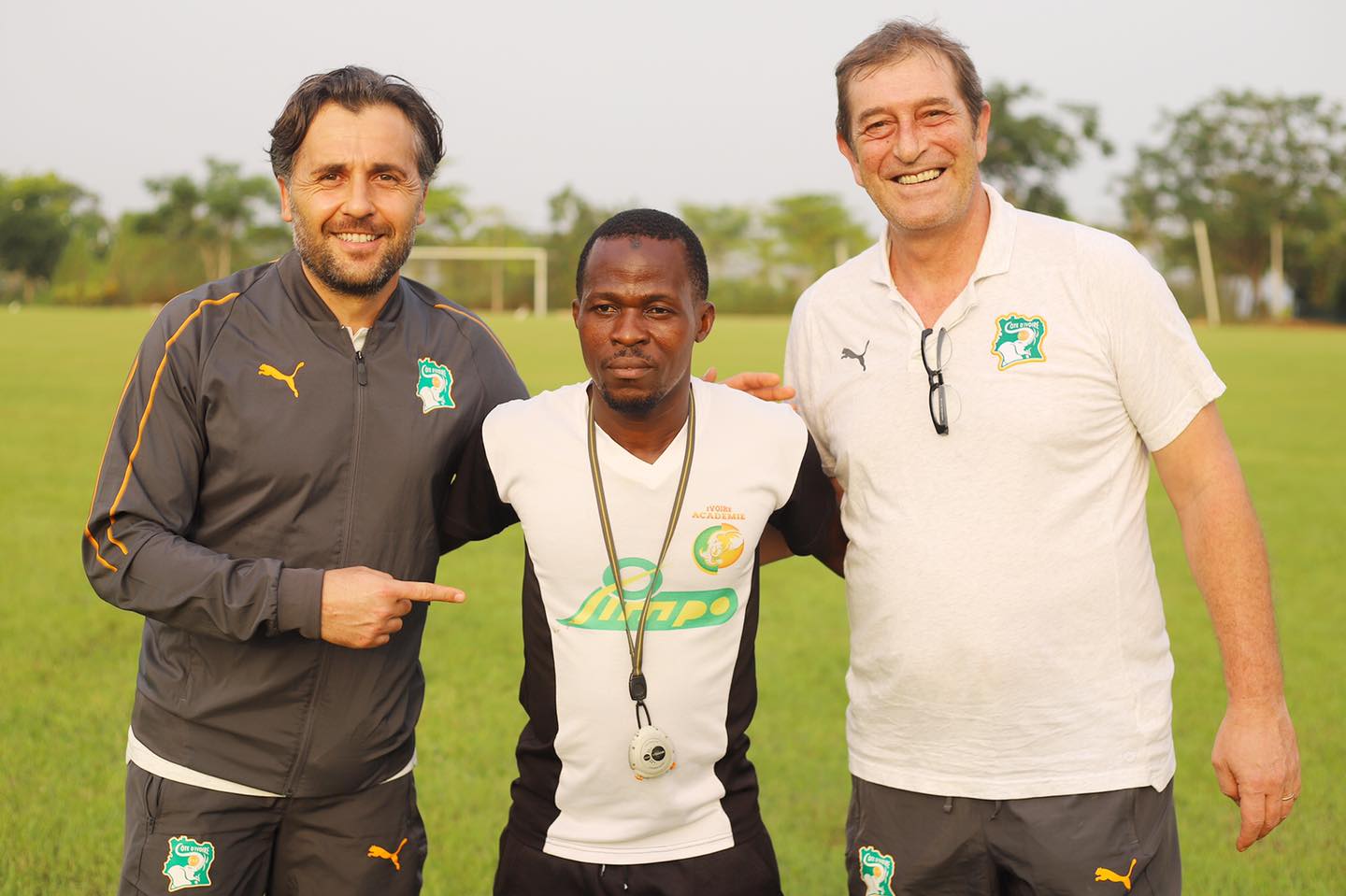 Le sélectionneur de l’équipe première des Éléphants de Côte d’Ivoire, Patrice Beaumelle accompagné de son adjoint et du sélectionneur de l’équipe A’ Maxime Gouaméné a rendu visite au Éléphanteaux en préparation à Songon dans les installations d’Ivoire Academie.