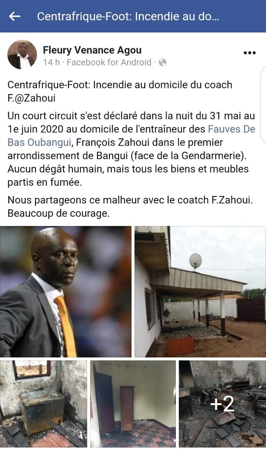 Dans cette période déjà rendue difficile par la crise sanitaire de la Covid-19, l'on apprend une triste nouvelle concernant notre compatriote François Zahoui, sélectionneur de la République Centrafricaine. Un incendie s'est en effet déclaré à au domicile de l'ex-coach des Éléphants dans la nuit du 31 mai au 1er juin 2020 informe notre confrère Fleury Venance Agou, depuis le pays des Fauves du Bas-Oubangui.
