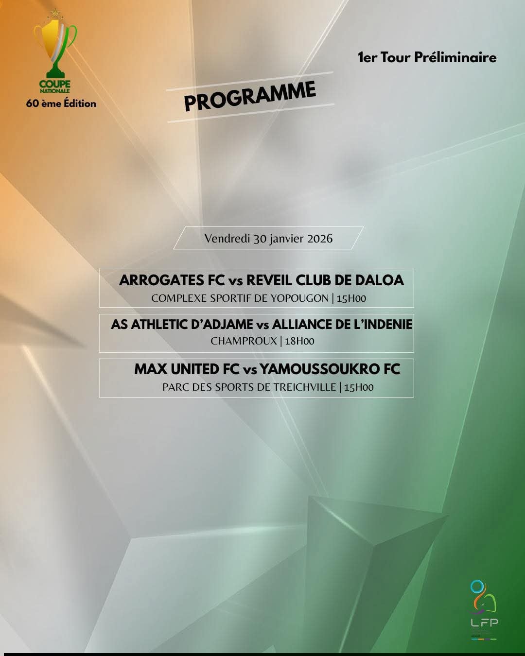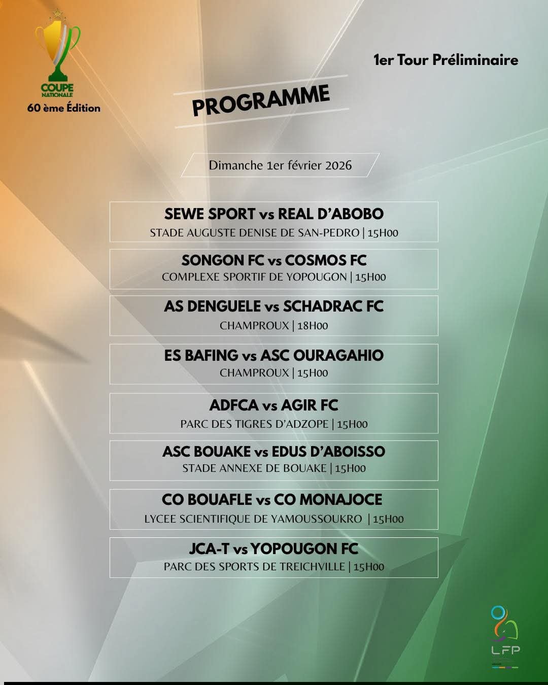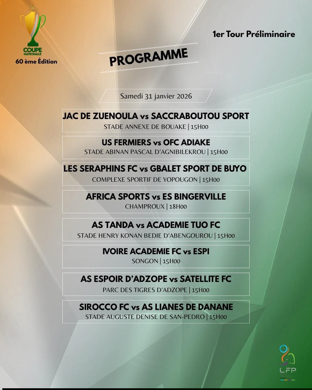 En plus de la Ligue 1 LONACI, la Coupe Nationale de Côte d'Ivoire sera de la partie ce weekend avec les affiches du premier tour préliminaire. Un tour qui concerne uniquement les club des Ligues inférieures.