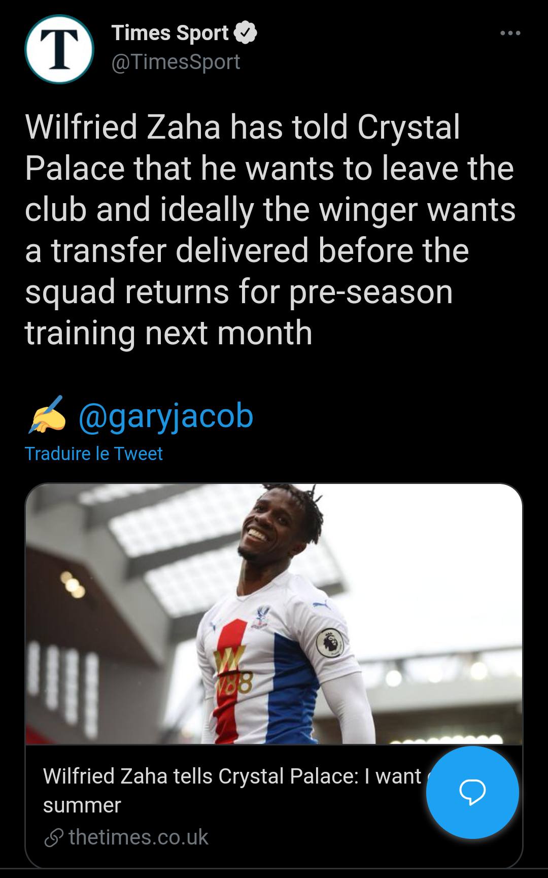 Comme il est de coutume depuis 4 saisons maintenant dans le club londonien, le dossier Zaha ressort de son tiroir à chaque période de mercato. Le refrain est le même : l’ailier réclame son départ et au finale il est maintenu au club faute d’offre à la hauteur des espérances de Crystal Palace. Il y a eu l’épisode Arsenal en 2019, puis Everton en 2020. 2021 nous réserve un nouvel épisode selon The Times. Le media britannique révèle en effet dans ses colonnes que Wilfried Zaha aurait déclaré une nouvelle fois à Crystal Palace son intention de quitter le club, et ce, avant la présaison prévue le mois prochain.
