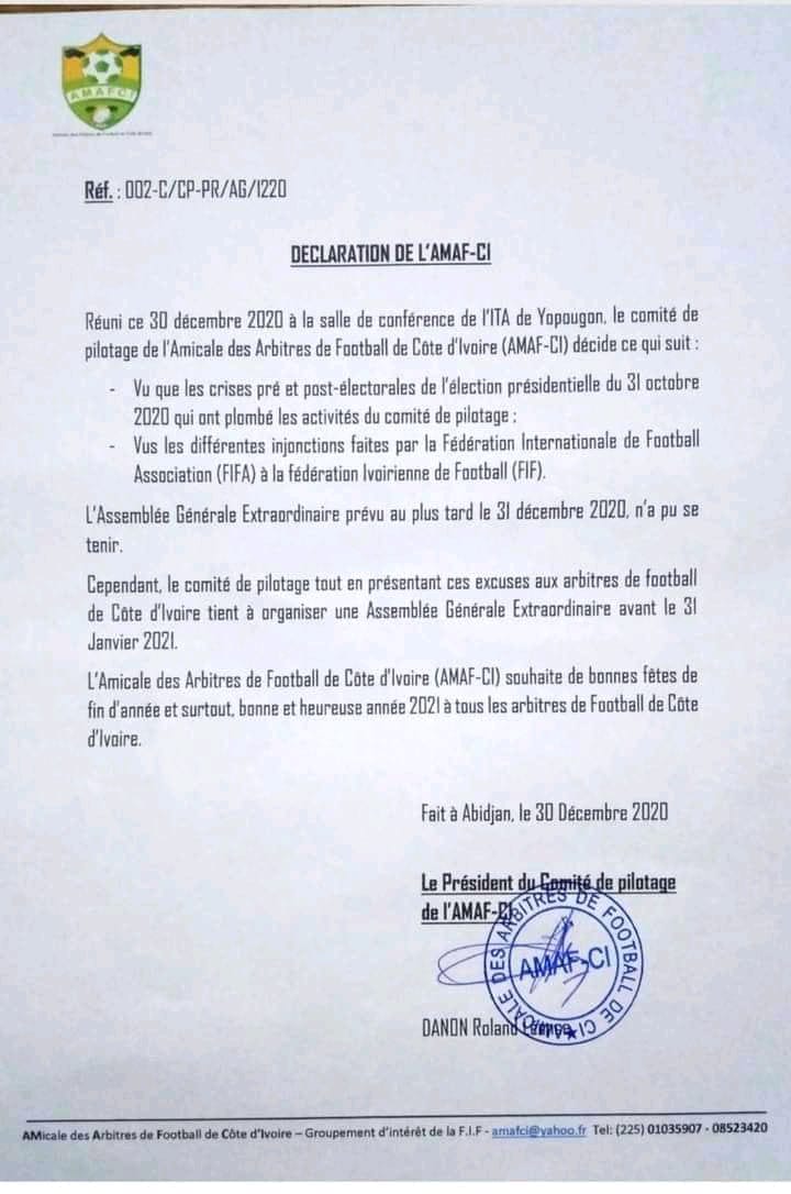 Censé avoir lieu ce 31 décembre 2020, l’Assemblée Générale Extraordinaire de l’Amicale des Arbitres de Football de Côte d’Ivoire (AMAF-CI) a été reportée au grand plus tard le 31 janvier prochain. Dans un communiqué paru ce jour, le Président du Comité de pilotage de l’amicale Danon Roland en a donné les raisons.