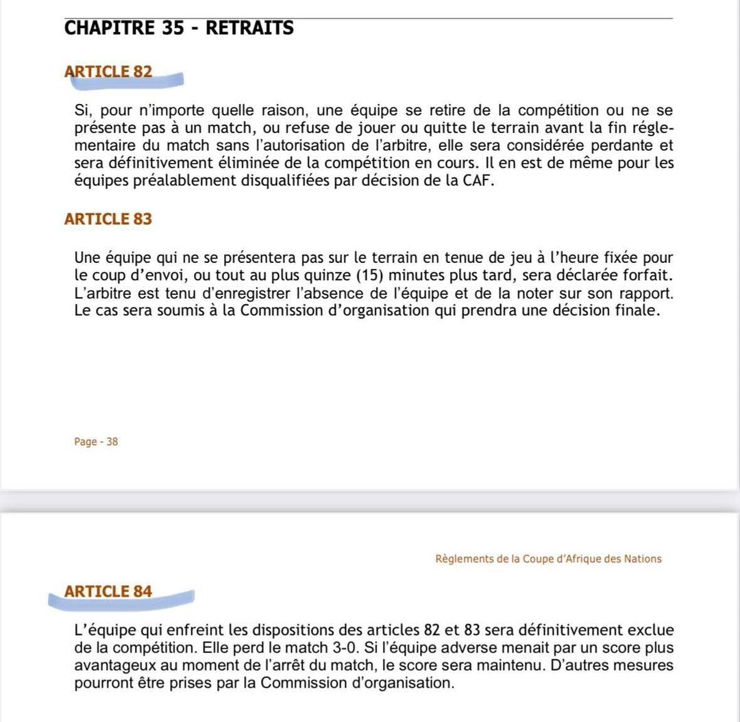 Rappelons que l'article 84 du Règlement de la Coupe d’Afrique des Nations (CAN) de la CAF régit les cas de forfait et d'abandon de match. Il stipule qu'une équipe qui refuse de jouer ou se retire avant la fin du temps réglementaire est déclarée forfait, entraînant une défaite 3-0, l'élimination directe et de possibles sanctions financières et sportives.