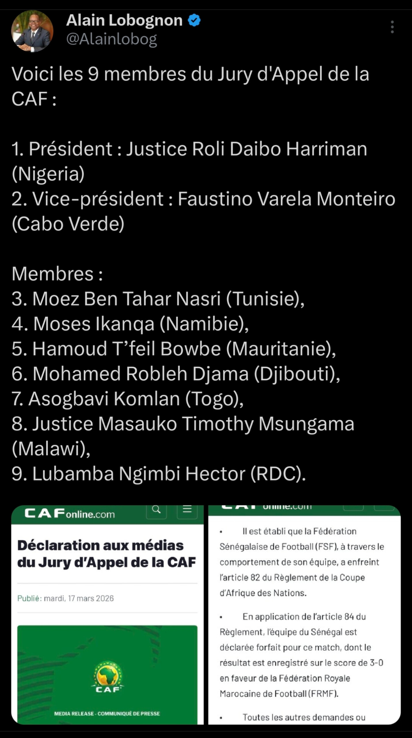 « Le Jury d’Appel de la Confédération Africaine de Football (CAF) a décidé, en application de l’article 84 du Règlement de la Coupe d’Afrique des Nations (CAN), de déclarer l’équipe nationale du Sénégal forfait lors de la finale de la TotalEnergies CAF Coupe d’Afrique des Nations Maroc 2025 (« le Match »), le résultat étant homologué sur le score de 3-0 en faveur de la Fédération Royale Marocaine de Football (FRMF) »