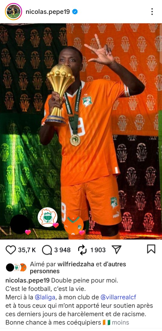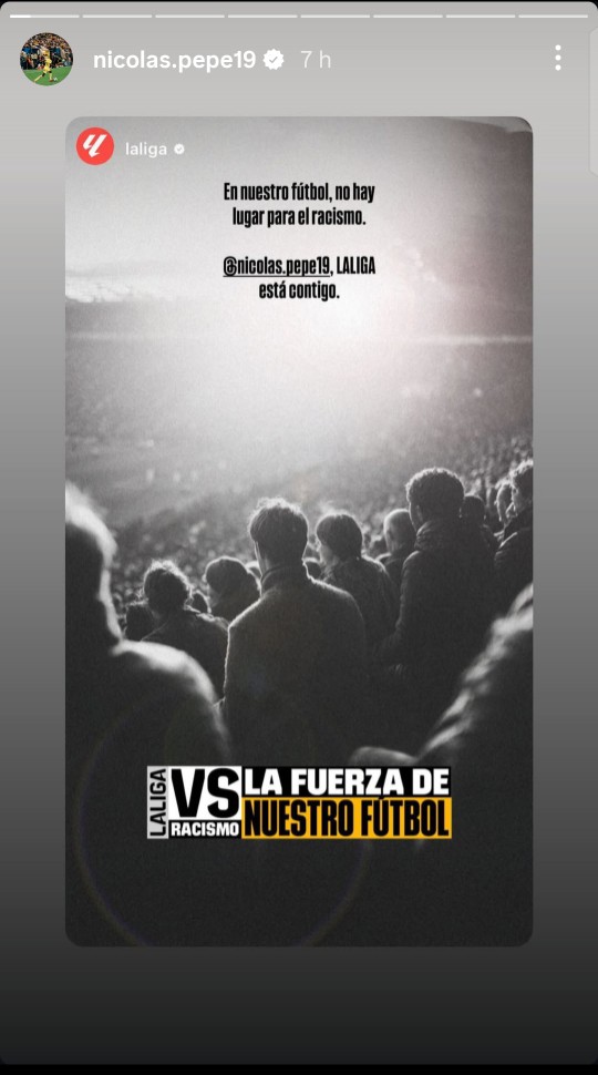 Merci à la Liga, à mon club Villarreal et à tous ceux qui m'ont apporté leur soutien après ces derniers jours de harcèlement et de racisme.