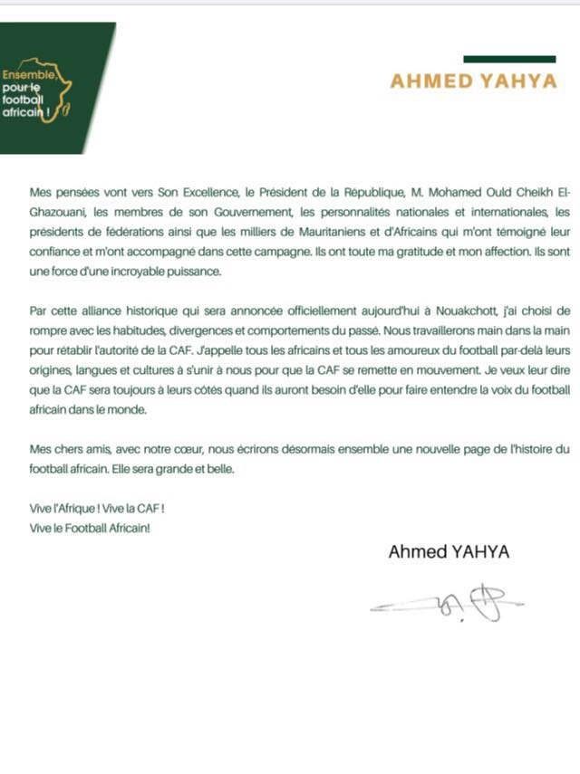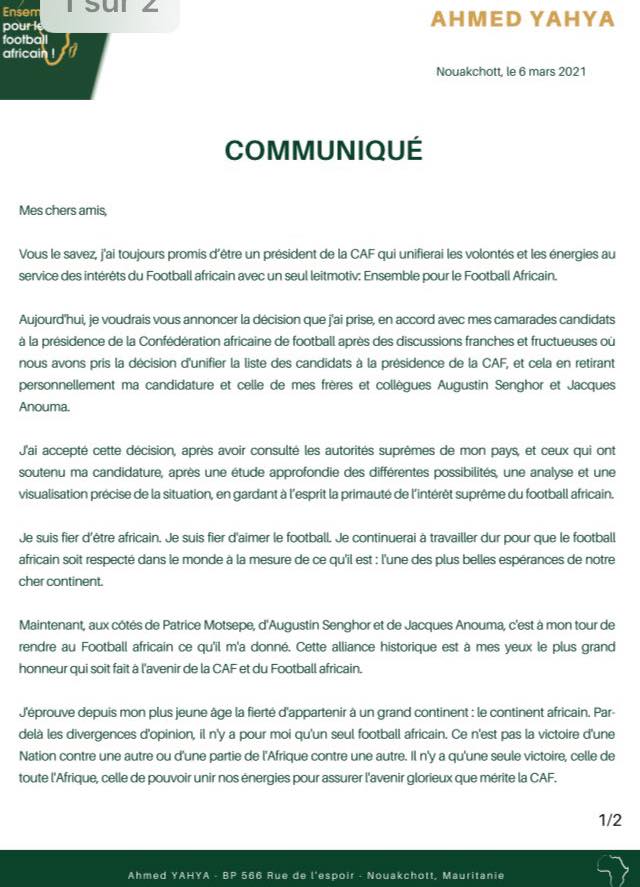 Le compromis trouvé par la FIFA pour l’élection de la CAF est plus que sûr avec le retrait de la candidature annoncé ce jour d’Ahmed Yahya. Le Président de la Fédération Mauritanienne de Football emboite ainsi le pas à Augustin Senghor et Jacques Anouma. Parlant du candidat Ivoirien, il a fait l’annonce du retrait de sa candidature hier en direct du journal télévisé de 20h de la télévision Ivoirienne. Ces 3 candidats retirés, Patrice Motsepe sera donc le futur Président de la Confédération Africaine de Football (CAF) comme il était convenu à Rabat en février dernier.