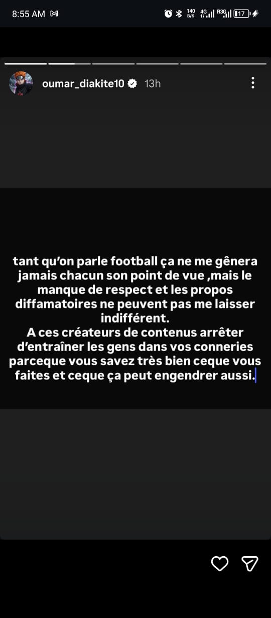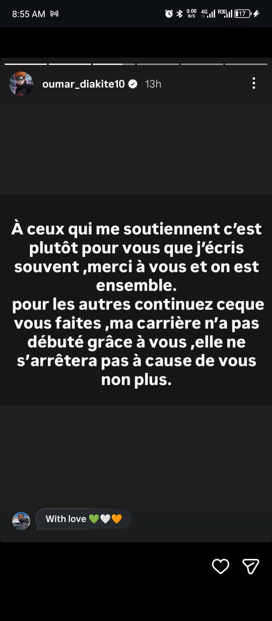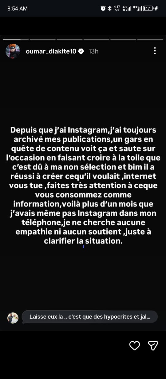 « Depuis que j’ai Instagram, j’ai toujours archivé mes publications. Un gars en quête de contenu voit ça et saute sur l’occasion en faisant croire à la toile que s’est dû à ma non sélection et bim, il a réussi à créer ce qu’il voulait. Internet vous tue, attention à ce que vous consommez comme information. Depuis que j’ai Instagram, j’ai toujours archivé mes publications […]. A tous ceux qui me soutiennent, c’est à vous que j’écris merci à vous et on est ensemble. Pour les autres, continuez ce que vous faites. Ma carrière n’a pas débuté grâce à vous, elle ne s’arrêtera pas à cause de vous non plus […]. Et j’oubliais… la pression sociale, ça ne fonctionne que sur les esprits faibles. »