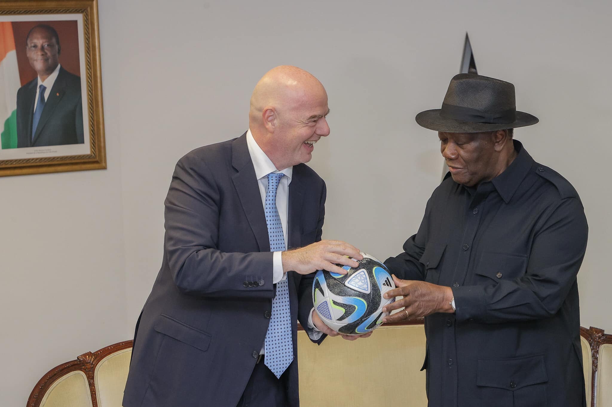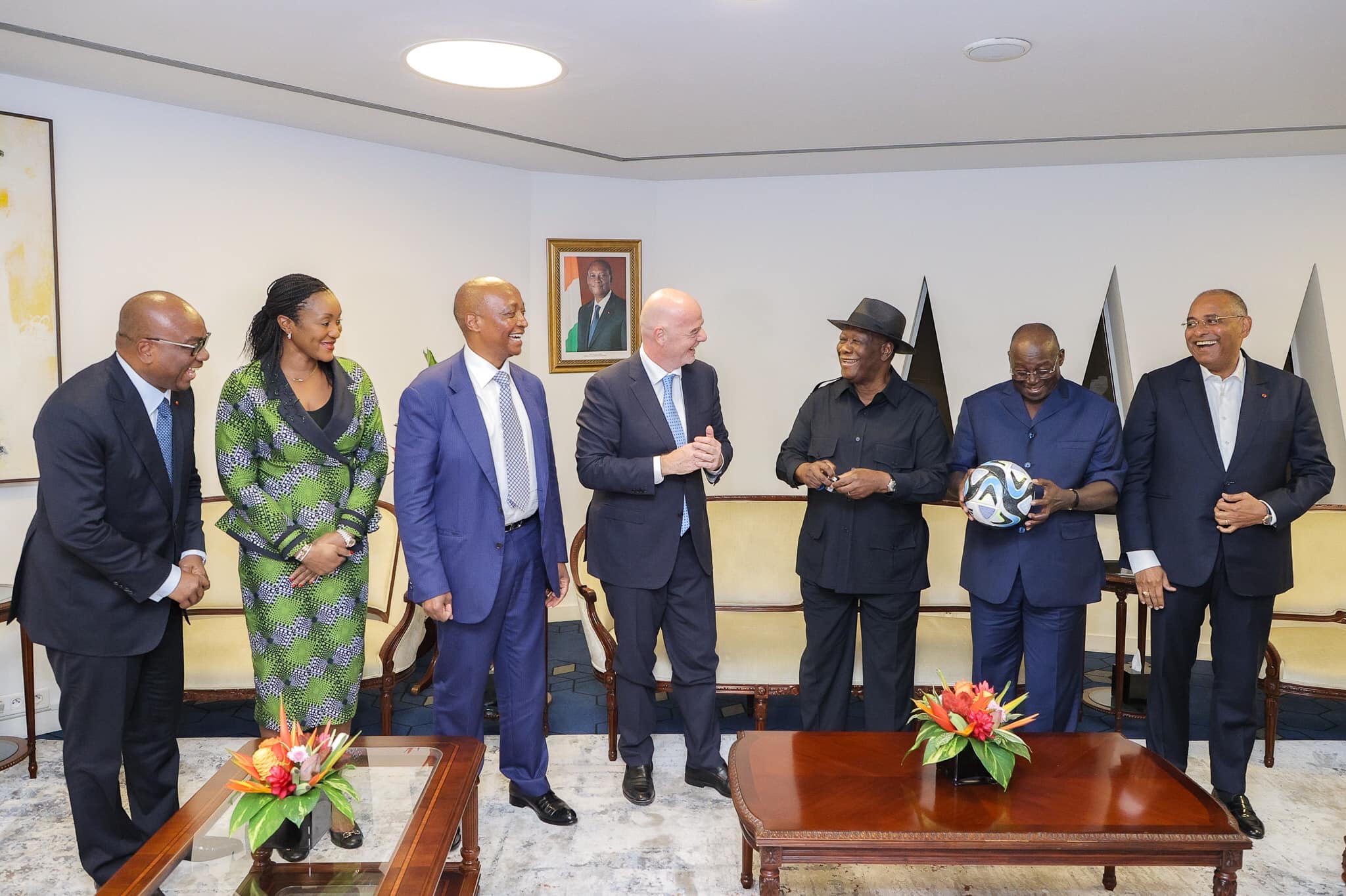 Ce jeudi 13 juillet 2023, le Sofitel Hôtel Ivoire a abrité la 45è Assemblée Générale Ordinaire de la Confédération Africaine de Football (CAF) et le tirage au sort des éliminatoires de la Coupe du monde zone Afrique. Après cet évènement, Gianni Infantino et Patrice Motsepe ont été reçus en audience par le Président de la République de Côte d’Ivoire, Alassane Ouattara. Le Président de la FIFA et celui de la CAF étaient accompagnés par le vice-Président Tiémoko Meyliet Koné, le Premier Ministre Patrick Achi et le Président de la Fédération Ivoirienne de Football (FIF), Idriss Diallo.