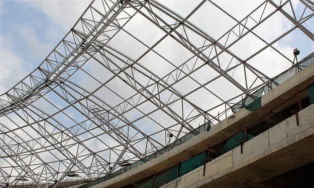 Le stade Olympique d’Ebimpé est splendide. Sa beauté se dévoile déjà. La pose de la charpente métallique est presqu’achevée.
