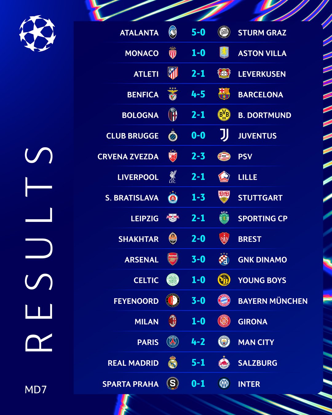 A Rotterdam, le Bayern a sombré avec une défaite 3 à 0 face à Feyenoord. Un doublé de Santiago Giménez (21’, 45+9’) et un but d’Ayasse Ueda ont suffi au bonheur de la formation Néerlandaise. L’ancien club des frères Kalou est 13è avec un point d’avance sur les Bavarois. A noter, les victoires du Milan AC et de l’Inter sur Gérone et le Slavia Prague. Les Interristes sont 4è avec 16 points et les Rossoneri pointent au 6è rang avec 15 points.