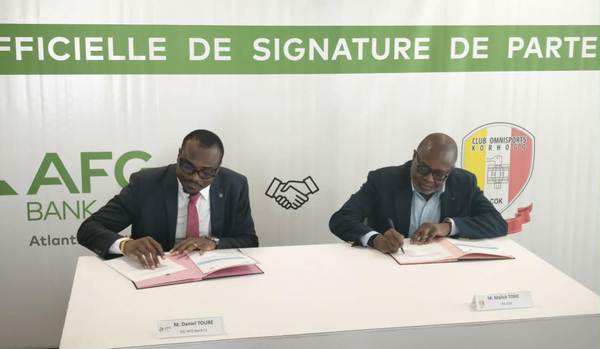 Sous la houlette du Président Malick Tohé, le Club Omnisports de Korhogo entend franchir un nouveau cap. Dans cette optique, le club de la cité du Poro a signé un partenariat avec l'AFG Bank ce mercredi 25 mars 2026 du côté de l'Ivoire Trade Center dans la commune de Cocody. Cette signature s'est tenue en présence de Daniel Touré, Directeur Général de l'AFG Bank Côte d'Ivoire, des dirigeants du club, des entraîneurs et une partie des joueurs.