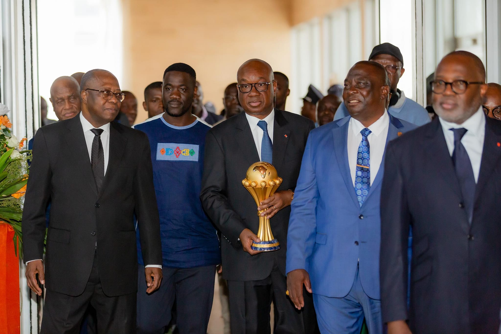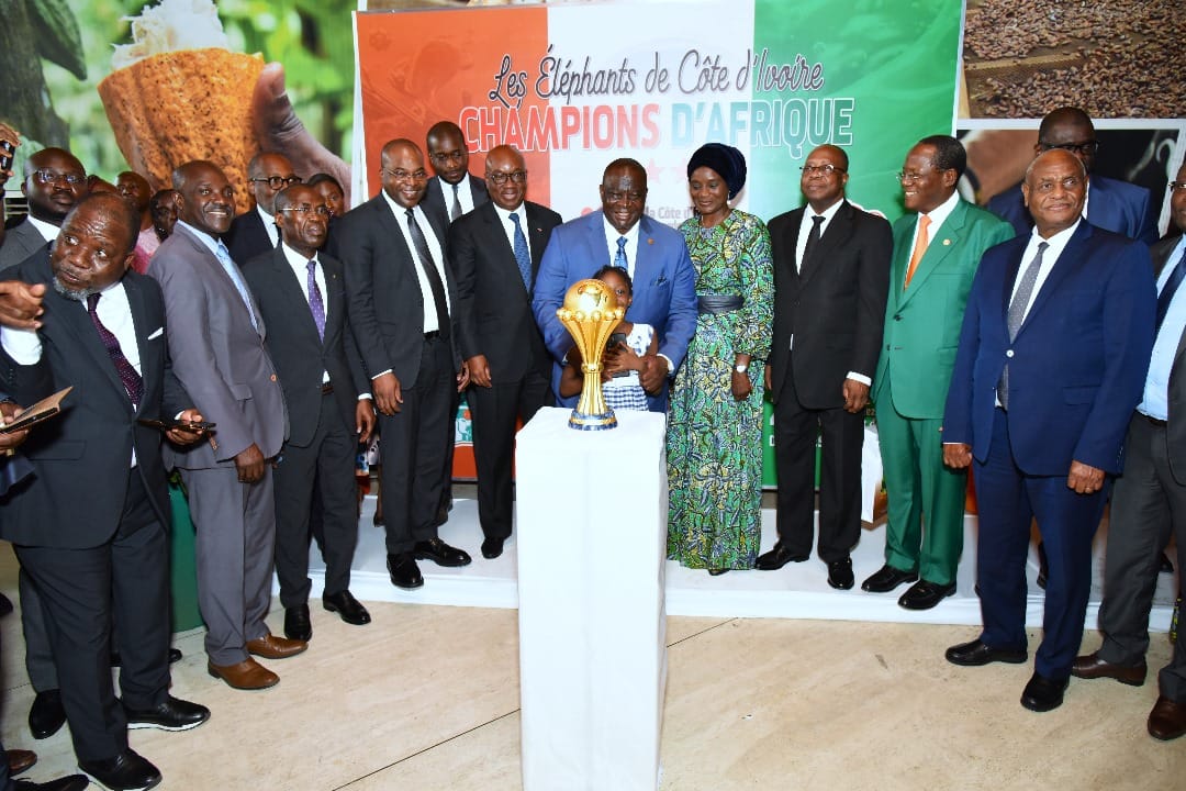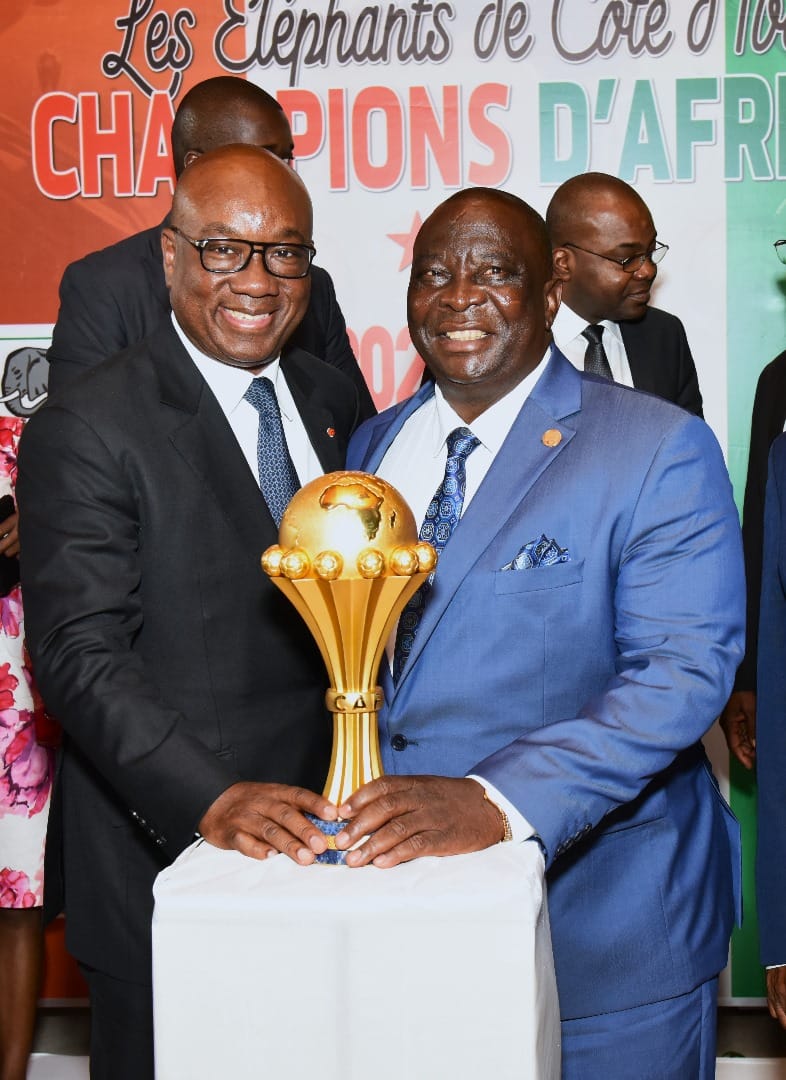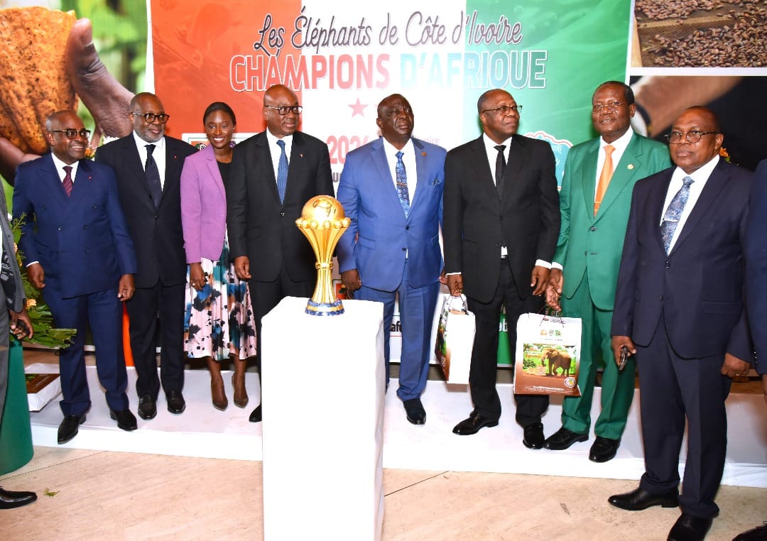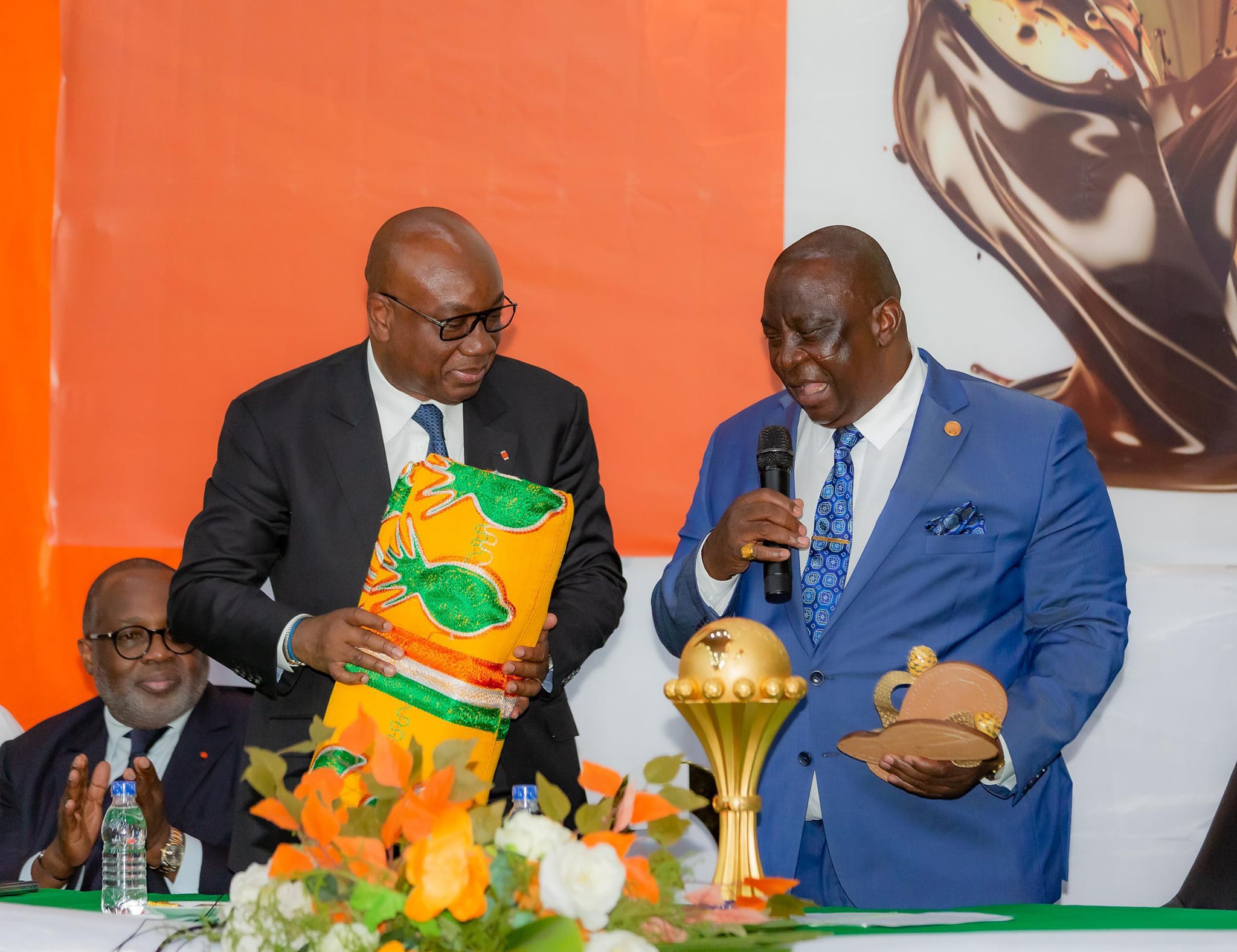 Le Président de la Fédération Ivoirienne de Football, les membres du Comité Exécutif et le sélectionneur national, ont présenté le trophée de la CAN 2023 à la grande famille du Conseil Café Cacao. Emerse FAE a remis symboliquement le trophée au Ministre de tutelle, le Ministre d'Etat, Ministre de l’Agriculture, du Développement Rural et des Productions vivrières, Kobenan Kouassi Adjoumani.