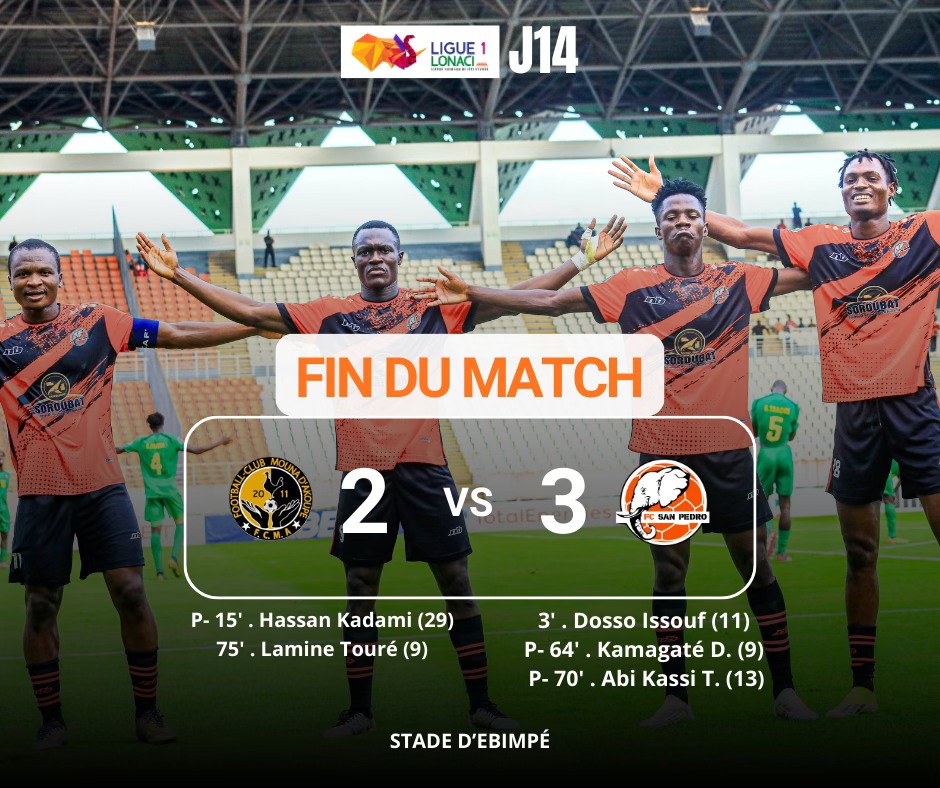 Après deux défaites de suite, les Pétrussiens se devaient de réagir cet après-midi face au FC Mouna. Les choses vont idéalement débuter pour le FC San Pedro avec l’ouverture du score de Dosso Issouf (3’). Hassan Kadami (64’) a égalisé pour la formation d’Akoupé avant le second but des oranges et noirs signé Kamagaté (64’p). Abi Kassi (75’) a donné deux buts d’avance au FC San Pedro mais Lamine Touré (75’) va redonner espoir à Mouna en réduisant la marque. Les hommes de Vincent Espié vont résister aux derniers assauts de l’adversaire et réussir à s’imposer 3 buts à 2. Le FC San Pedro prend la seconde place avec 25 points, soit quatre longueurs de plus que Mouna qui est 5è au classement.