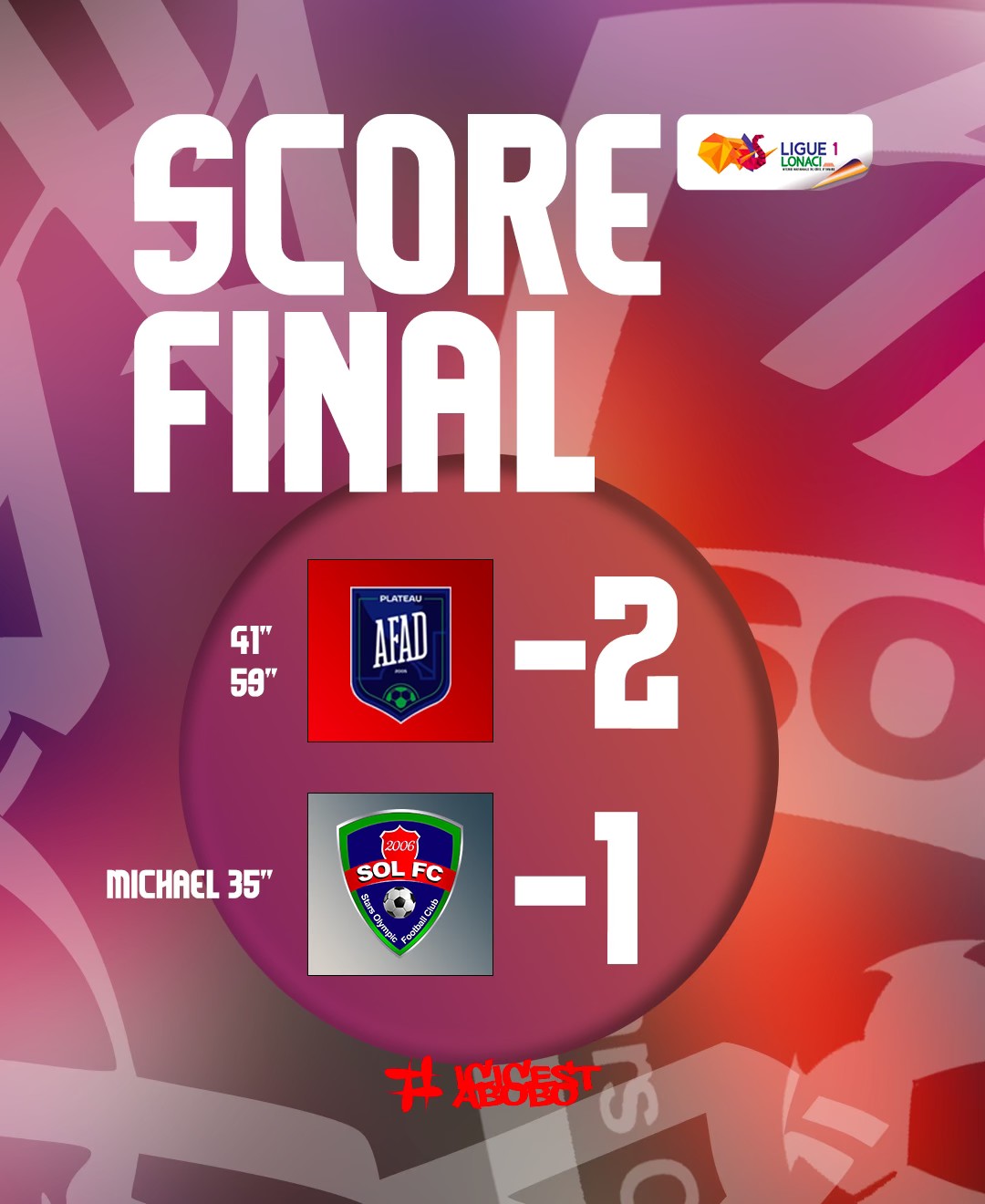 Au Félicia, l’AFAD a pris le meilleur sur SOL FC sur un score de 2 buts à 1. Les Abobolais vont pourtant débloquer la rencontre avec une réalisation de N’Guessan Michel à la 36è minute de jeu. Les Afadistes vont égaliser à la 42è avant de prendre l’avantage en seconde période. Ce succès permet à la formation du Plateau de revenir à hauteur de son adversaire avec 19 points. A noter, le nul vierge (0-0) entre l’US Tchologo et l’ES Agboville. Avec 22 points, Tchologo est en 5è position. Le club de l’Agnéby est bon dernier avec 13 points.