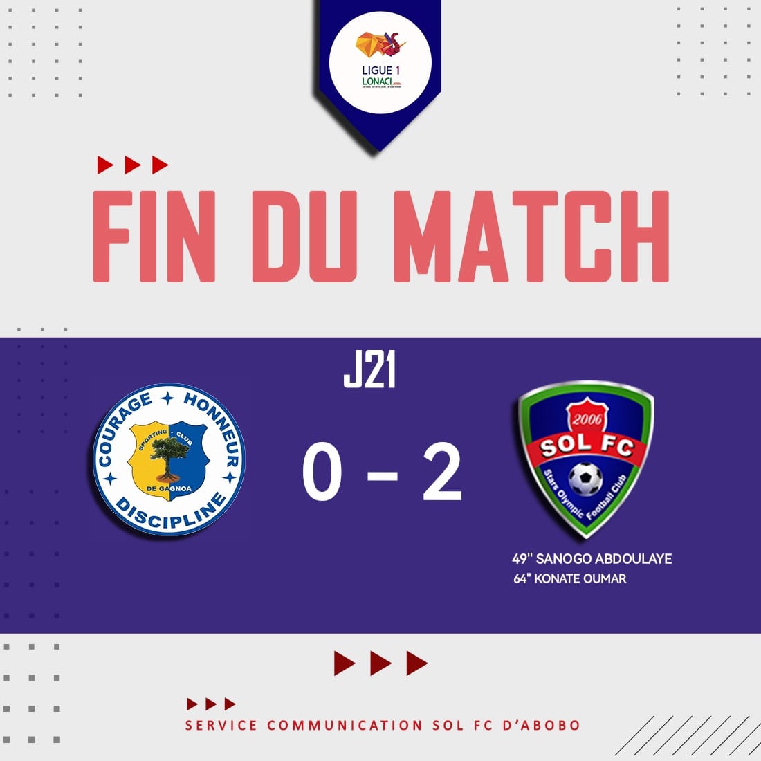 A San Pedro, le LYS Sassandra s’est incliné 1 but à 0 devant le Stella Club d’Adjamé. Le but des Magnans a été inscrit par Traoré Mohamed à la 22è minute. Le Stella s’installe à la 8è place avec 29 points tandis que LYS est logé au 11è rang avec 22 points. Le gros coup de la journée a été réalisée par SOL FC qui est allé battre à Gagnoa le Sporting 2 à 0. Les poulains de N’Dri Romaric sorte de la zone rouge en se classant au 11è rang avec 21 points. De leur côté, les Gagnoalais sont 14è avec 21 points.