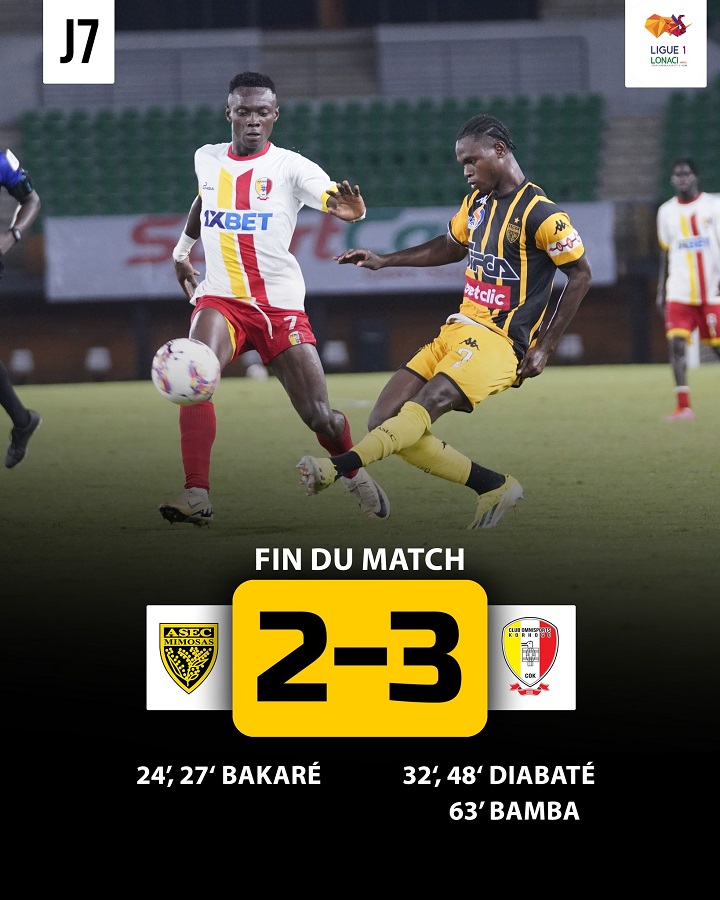Les jaunes et noirs ont manqué l’occasion de prendre leur distance en tête de classement. Opposés au Club Omnisports de Korhogo, les poulains de Julien Chevalier se sont inclinés 3 buts à 2. Après avoir mené 2 à 0 grâce à un doublé de Bakaré, la formation de l’ASEC Mimosas s’est littéralement sabordée en concédant l’égalisation sur un doublé de Diabaté (32’, 48’). A la 63è minute, Bamba a mis fin aux espoirs des protégés du Président Roger Ouégnin. Malgré cette défaite, les Mimos conservent leur fauteuil de leader toujours à égalité avec le FC San Pedro et le Stella Club d’Adjamé.