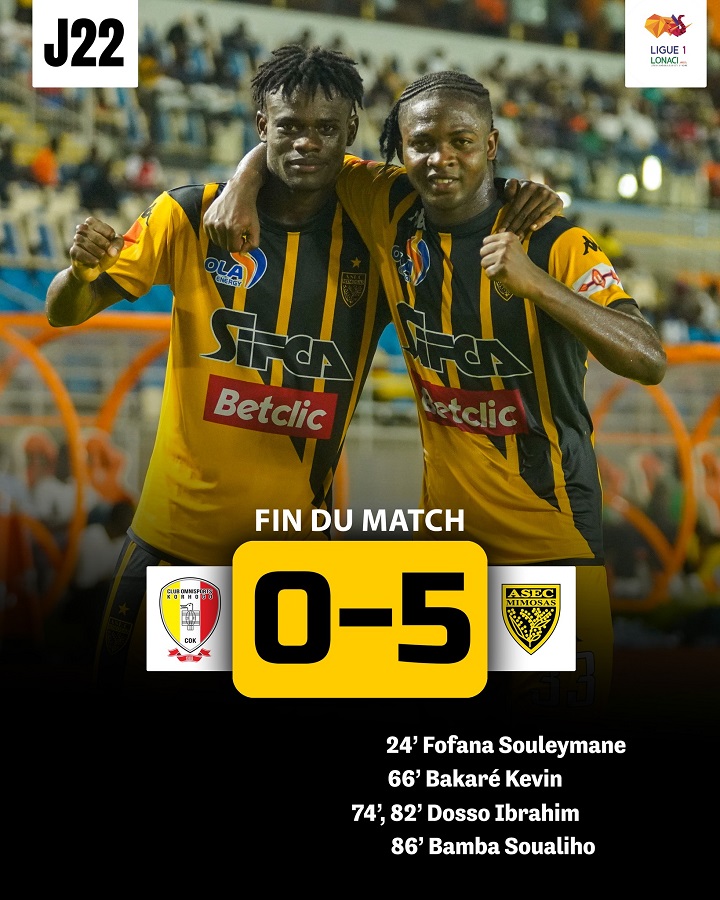 Les jaunes et noirs continuent de dominer les débats dans le championnat Ivoirien de première division. En déplacement dans le nord du pays pour affronter le Club Omnisports de Korhogo dans le cadre de la 22è journée, l’ASEC Mimosas a déroulé avec une victoire 5 à 0. Fofana Souleymane (24’), Bakaré Kevin (66’), Dosso Ibrahim (74’, 82’) et Bamba Soualiho (86’) ont inscrit les buts de la rencontre. Avec ce succès, les protégés du Président Roger Ouégnin comptent désormais 46 points. Le COK de son côté est logé à la 6è place avec 31 points.