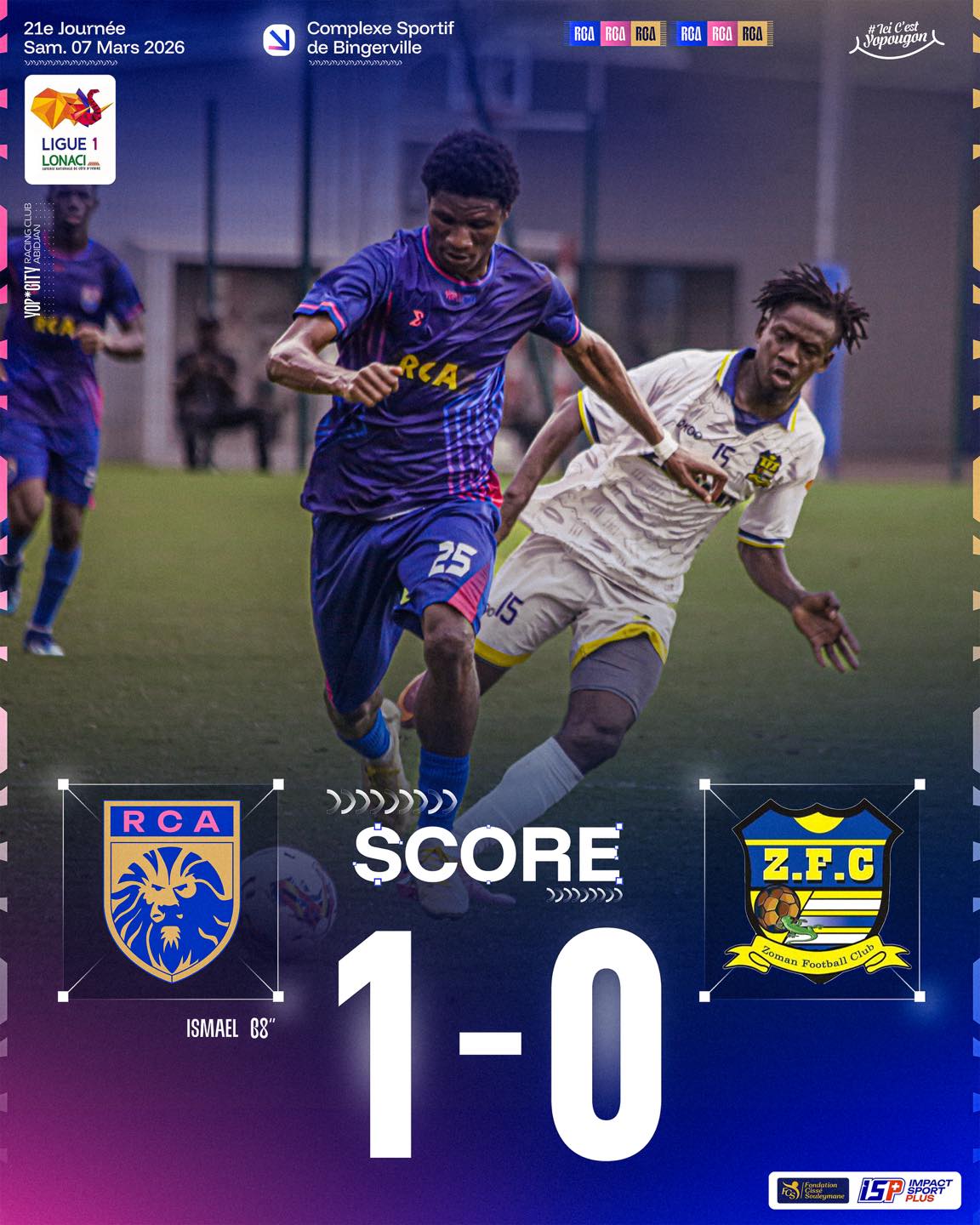 Après des débuts difficiles, le Racing Club d’Abidjan semble avoir trouvé sa vitesse de croisière dans cette seconde partie de saison. Pour preuve, le club a signé sa 5è victoire ce samedi face à Zoman FC. Les protégés du Président Cissé Souleymane se sont imposés 1 à 0 grâce à un but de Soumahoro Ismael (67’). Court succès mais précieux pour le club de Yopougon qui s’éloigne de la zone de relégation. Le RCA occupe la 10è place avec 26 point, soit une longueur de plus que son adversaire du jour.