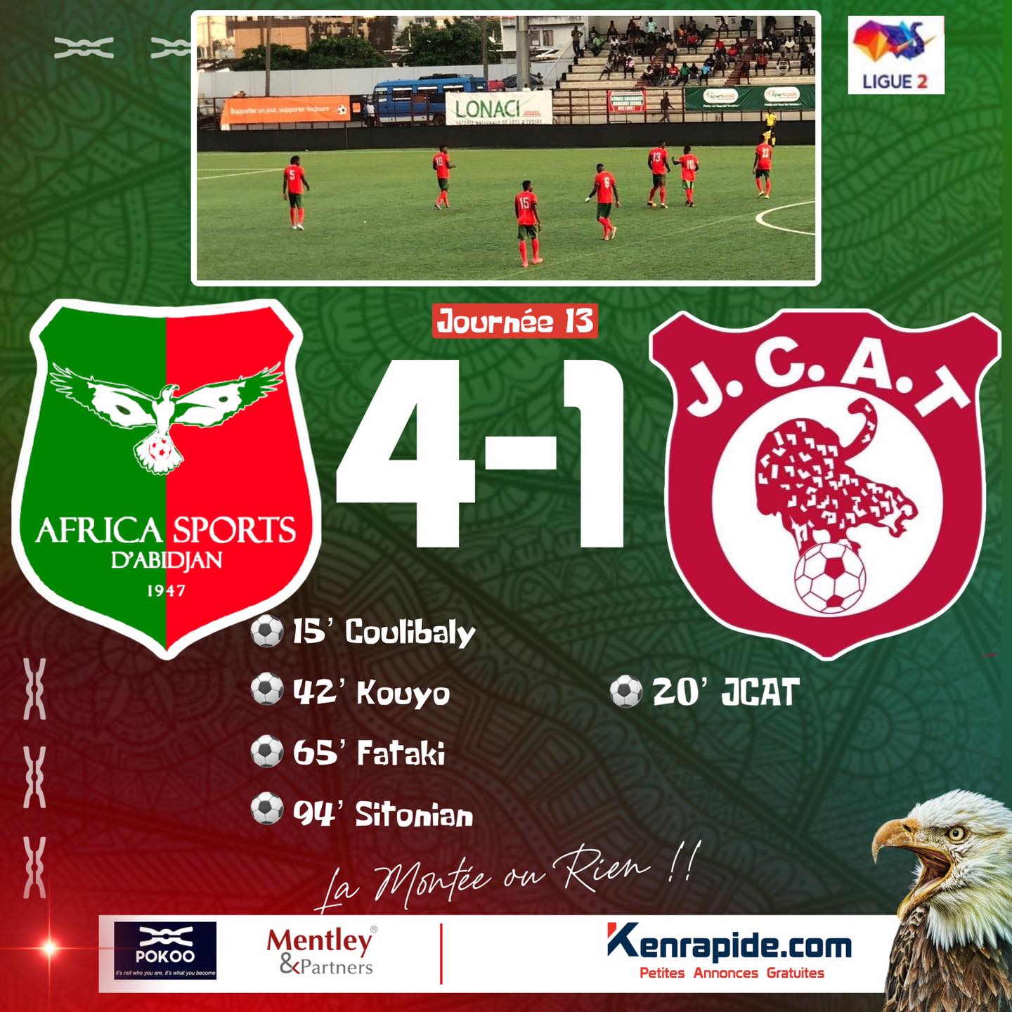 Après deux résultats nuls de suite, l’Africa Sports a renoué avec la victoire ce lundi 12 dans le cadre de la 13è journée de la Ligue 2. Opposés à la JCAT cet après-midi au stade Robert Champroux de Marcory, les Aiglons se sont imposés sur le score de 4 à 1 grâce à des réalisations de Coulibaly (15’), Kouyo (42’), Fataki (65’) et Sitonian (90+4’). La défense de la formation de Treichville n’a pas pu résister à la fougue des joueurs de Mohamed Aït Hida qui ont été piqués par l’esprit de la gagne.