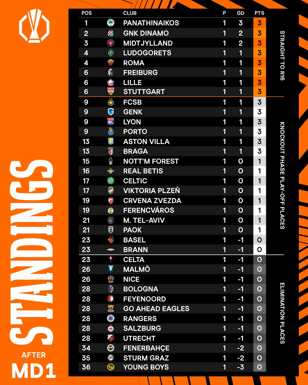 Le LOSC a idéalement débuté sa campagne Européenne. Opposés à Brann, les Lillois se sont imposés 2 buts à 1 grâce à des buts d’Hamza Igamane (54’) et Olivier Giroud (80’). Tout comme Lille, Lyon a pris les trois points sur la pelouse du FC Utrecht suite à une victoire 1 à 0. Le but de Tanner Tessmann à la 75è minute a fait le bonheur des Gones. A la Mercedes-Benz Arena, Stuttgart a disposé du Celta Vigo 2 à 1 avec des réalisations signées de Badredine Bouanani (51’) et Bilal El Khannouss (68’).
