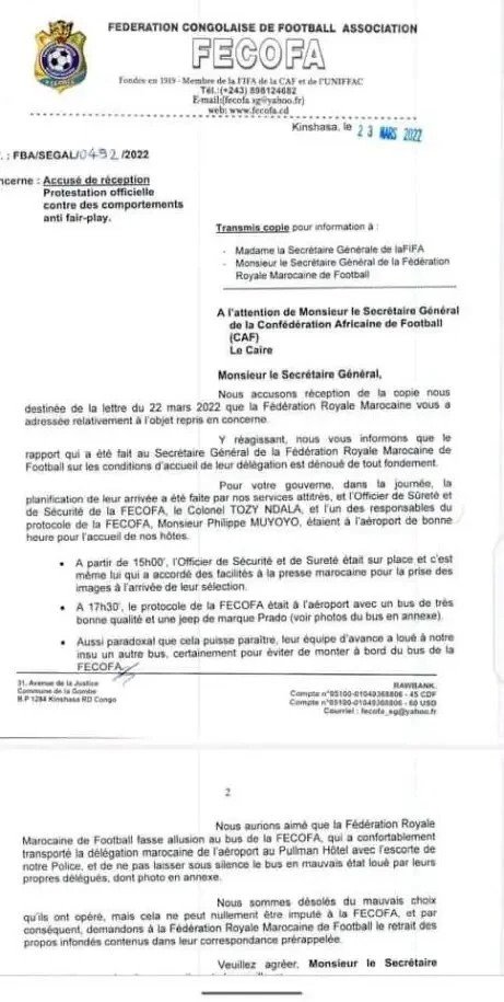 « Nous aurions aimé que la FRMF fasse allusion au bus de la Fecofa, qui a confortablement transporté la délégation marocaine de l’aéroport jusqu’à l’hôtel avec l’escorte de notre police et de ne pas laisser sous silence le bus en mauvais état loué par leurs propres délégués. Le protocole de la Fecofa était à l’aéroport avec un bus de très bonne qualité et une jeep de marque Prado. Aussi paradoxal que cela puisse paraître, leur équipe d’avance a loué à notre insu un autre bus, certainement pour éviter de monter à bord du bus de la FECOFA. Nous sommes désolés du mauvais choix qu’ils ont opéré, mais cela ne peut nullement être imputé à la Fecofa. Par conséquent, nous demandons à la FRMF le retrait des propos infondés contenus dans la correspondance pré-rappelée ».